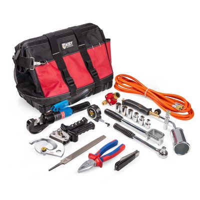 • горелка пропановая ПГ; • пресс гидравлический ПГР-70; • набор для монтажа болтовых наконечников и соединителей НМБ-6; • нож монтерский складной НМ-01; • пассатижи; • ножницы секторные НС-45; • напильник плоский; • рулетка 3 м; • прочная сумка С-01 с резиновым дном и большим количеством отделений |